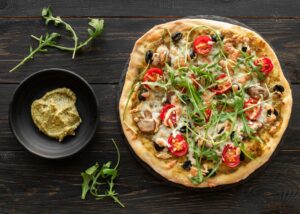dough or you can use baking paper). - Put the pesto sauce, cheese and the other toppings.