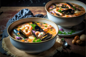 evaporated milk, then bring to boil. - Add all the seafood and vegetables, stir and add the black pepper.